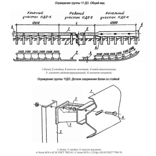 Барьерное ограждение изготавливается из листовой стали (ПС или СП) толщиной 3 мм. Секции балки имеют форму гнутого профиля. Металлическое барьерное ограждение состоит из секций балки, дорожной стойки (швеллера), стойки и элемента начального и конечного участка, консоли-амортизатора или жесткой консоли, комплекта крепежа и световозвращающими элементами. Ограждение обладает высокими сдерживающими характеристиками.
